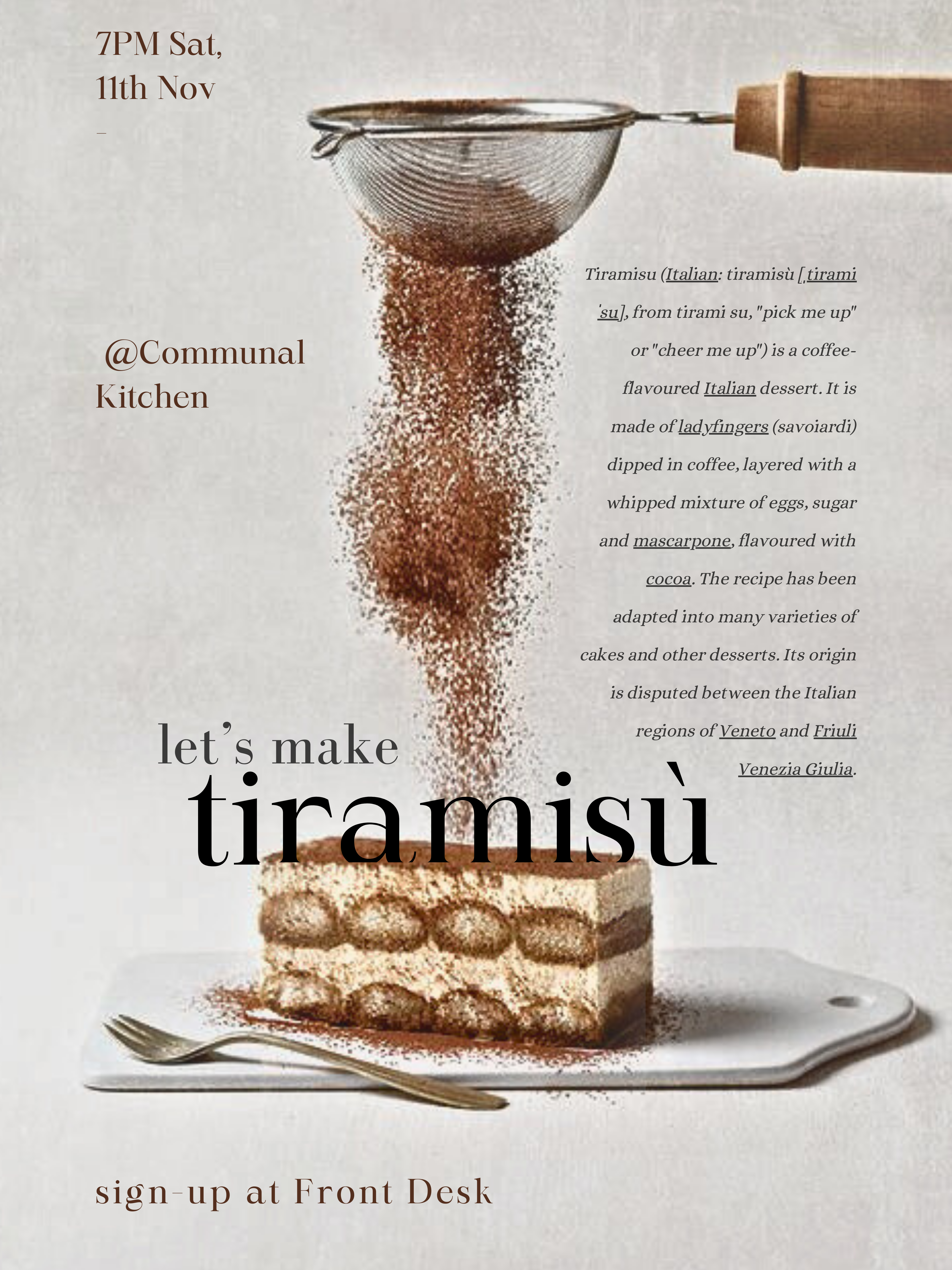 Come and sign up at the front desk to make your own most popular dessert “Tiramisu”.
