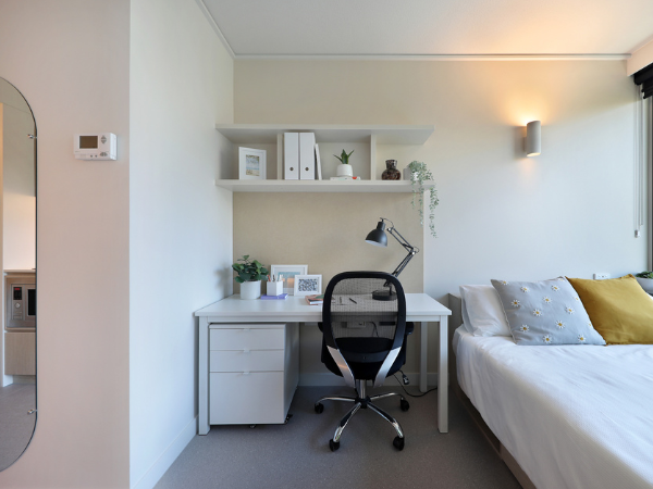 - Study desk, drawers, chair, and lamp